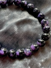 紫色、白色、黒色からなるマーブル模様が特徴で、特に不安や緊張、恐怖心などからくる不安定な精神状態を落ち着かせ、心身の毒素を浄化する働きがあるとされています。